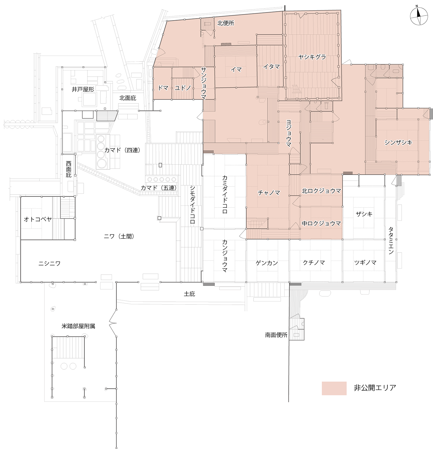 扉構えは中央に板戸両開き、東側に潜戸片開き、両側を真壁腰板付としています。扉構えの西室は土間とし、南面東端に大戸口を配します。天丼の東南隅およそ1間四方を吹抜けとしています。東室は南面に出格子を設けた8畳間で、この東側に東西1間、南北2間の下屋を配し、下屋東面に出入口を設けます。下屋は南半分を踏み込み土間とし、北半分を板間とします。