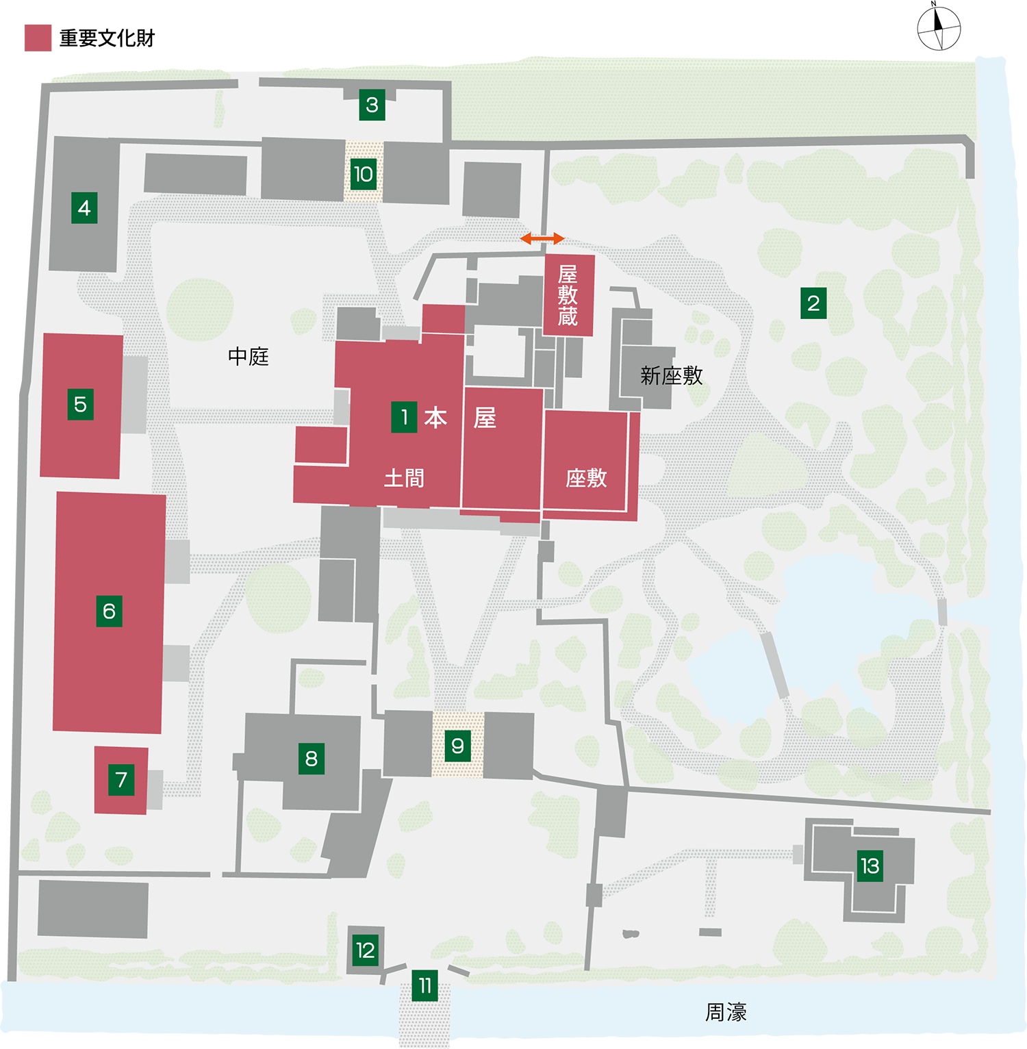 嘉永以前の古図では、建物北面平入り、中央に式台を構え、奥に玄関・10畳間を、東方に土間勝手口・4畳板間・湯殿・便所を、西方にトコ付14畳座敷・西面附属便所を配し、南面に内縁を廻し、居住するための間取りとなっています。