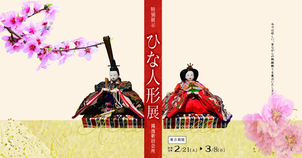 ひな人形展 今は珍しい、昔ながらの御殿飾りを展示いたします。 会場『本屋』 会期2026年2月21日(土)~3月8日(日) 休館日月曜日(祝日の場合は翌日) PDFはこちら 〉 -